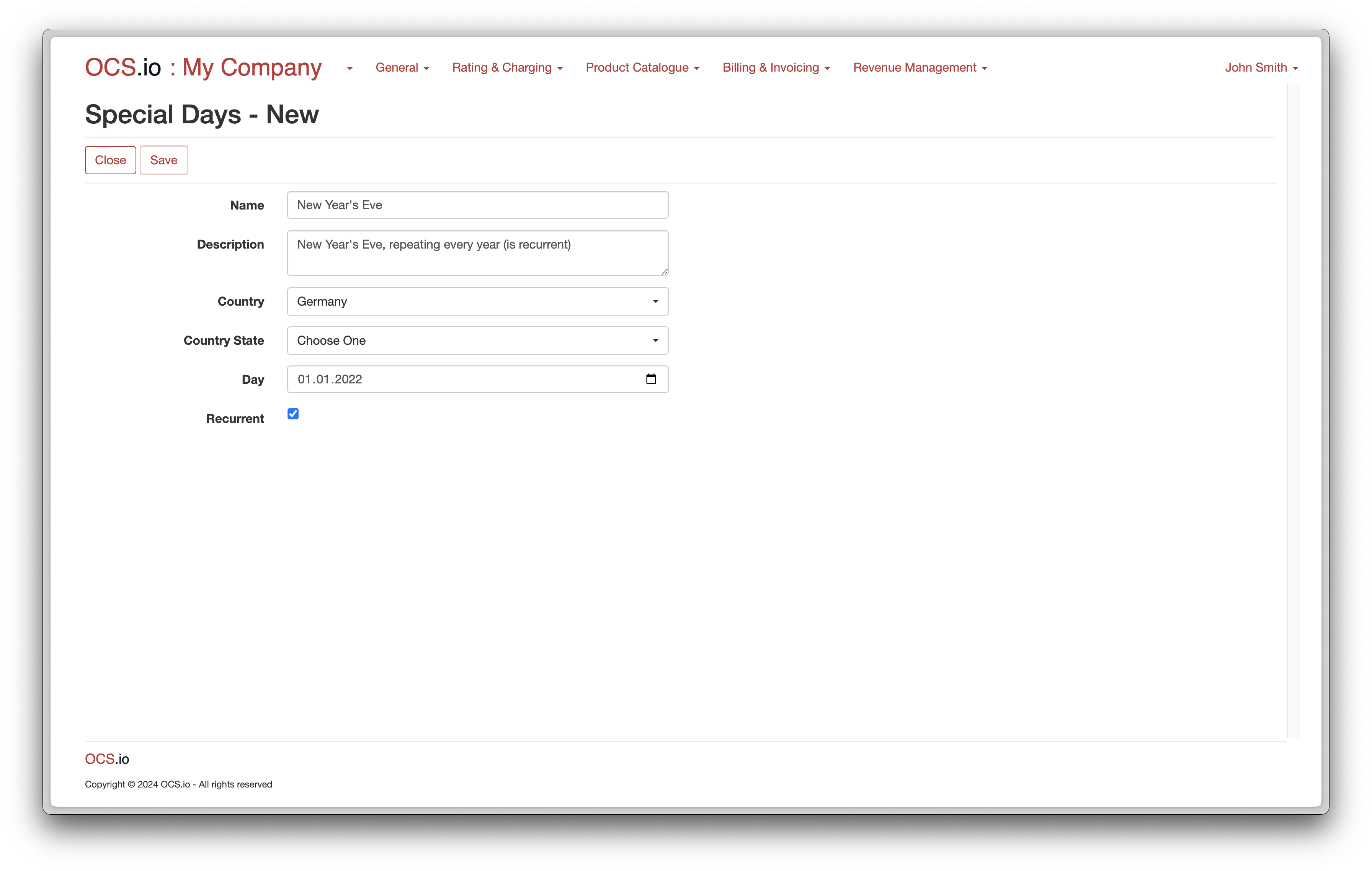 In OCS.io, a Special Day is a predefined date representing a public holiday or other special days in a specific country or region. This feature is used to identify specific days with a different pricing structure or charging model than regular days. For example, some countries may have other pricing plans for weekends or public holidays. The special day feature allows the system to apply the correct pricing to such days accurately. Once a special day is defined, the system automatically applies the appropriate pricing structure or charging model to the affected events.